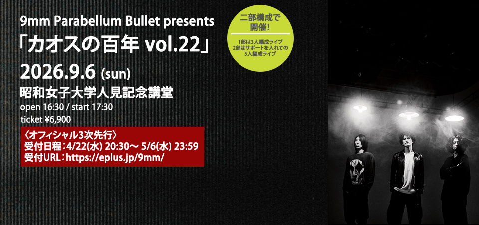 9月6日(日)「カオスの百年 vol.22」の詳細解禁!&9月9日(水)9mmの日から新曲を引っ提げた全国ツアー『9mm Parabellum Bullet Tour 2026-27「Raison d’être」』の開催も決定!